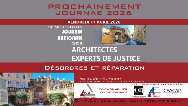 3e Journée Nationale des Architectes Experts de Justice Par admin16 mars 202617 avril 2026Hotel de Maliverny, Aix en ProvenceInscriptionExperts en Justice